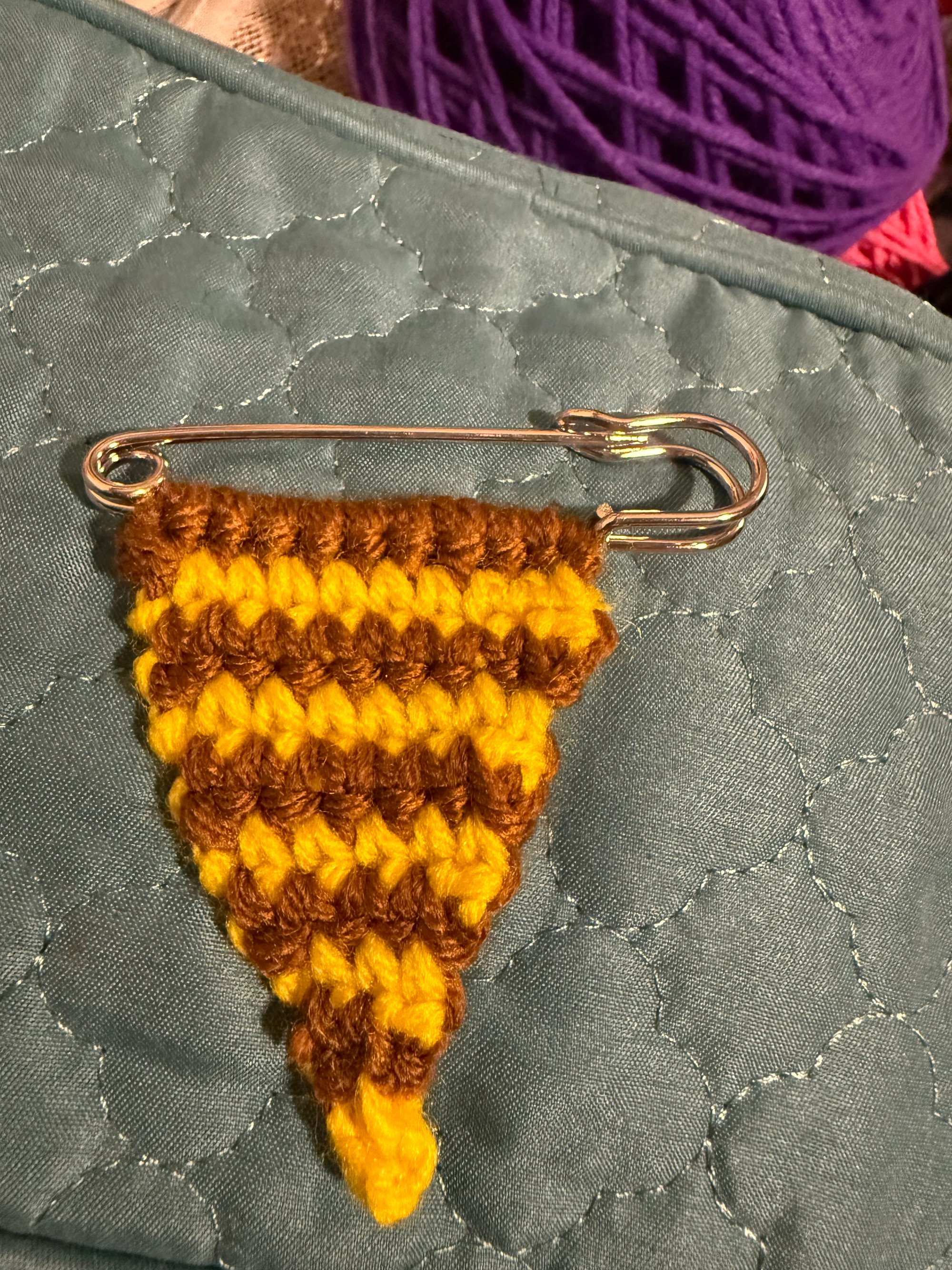 This is a triangle piece crocheted on o a safety pin using two different colors. The safety pin measures around 2 1/2’’ and the triangle piece from tip to base is 2’’.