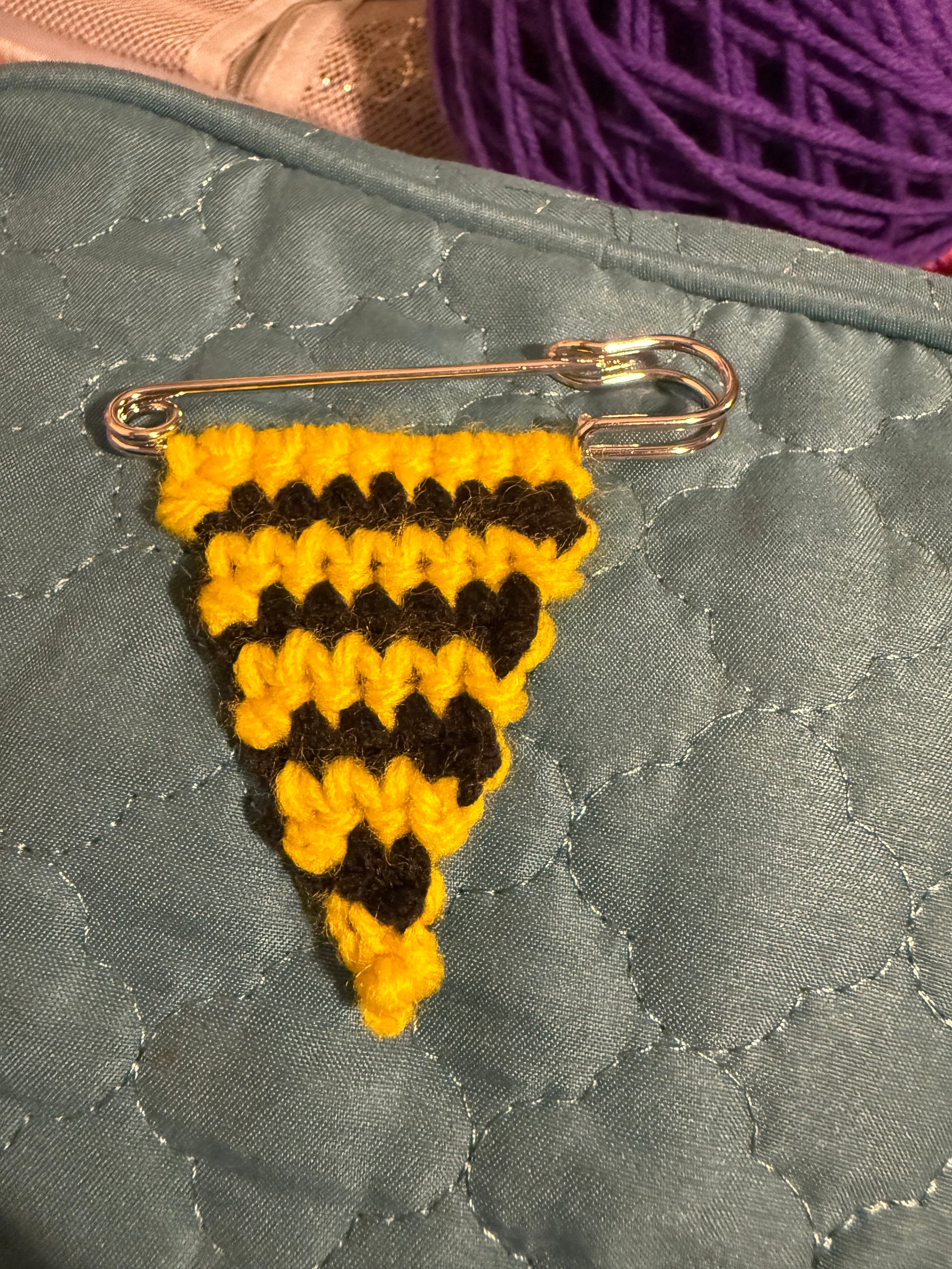 This is a triangle piece crocheted on o a safety pin using two different colors. The safety pin measures around 2 1/2’’ and the triangle piece from tip to base is 2’’.